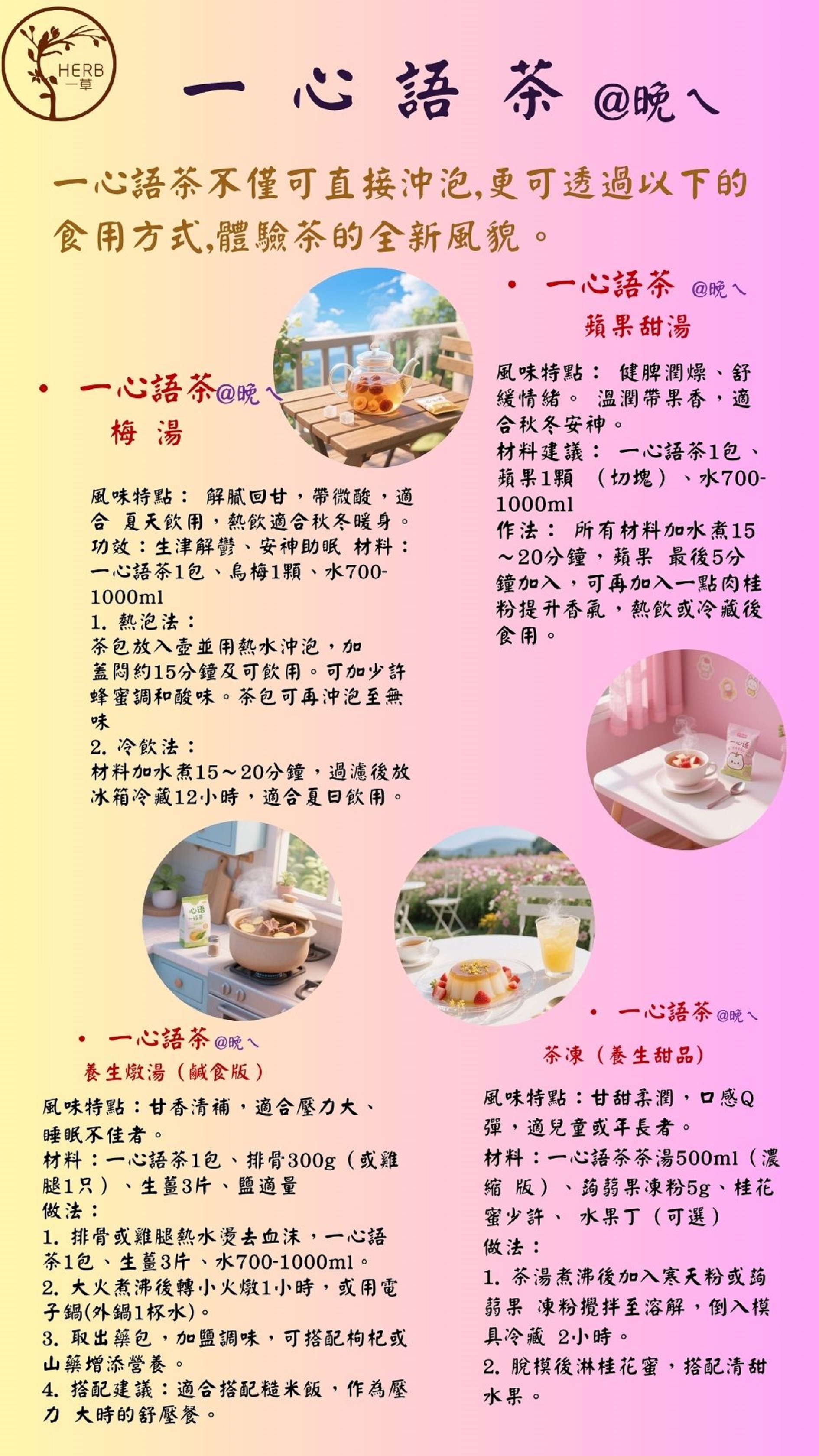 《一心語茶》以「草本養心」為理念,選用天然玫瑰、桑葚、甘麥大棗、