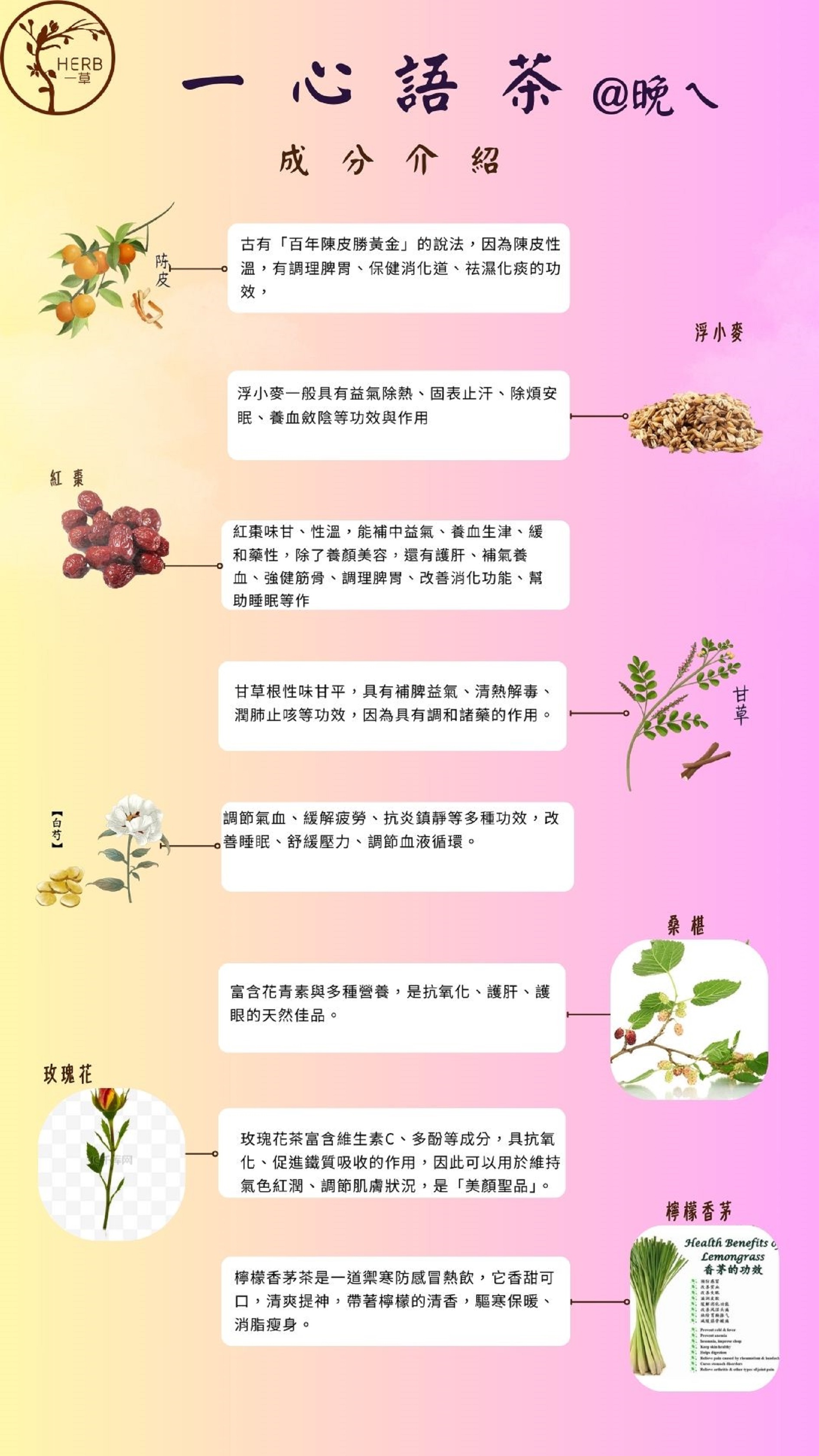 內容物 :甘草、小麥、大棗、白芍、陳皮、玫瑰、桑葚、檸檬香茅